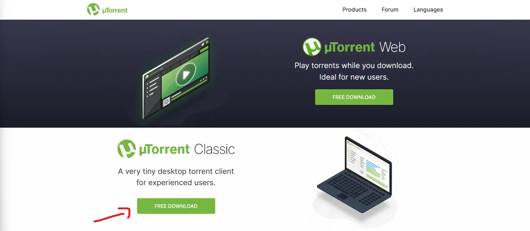 من الممكن استخدام uTorrent من خلال نسخته على الويب. ومع ذلك، إذا كنت تفضل تثبيته على جهاز الكمبيوتر الخاص بك، يجب عليك تنزيل ملف التثبيت الخاص به. وفي معظم الحالات، من الأفضل القيام بذلك من موقع المطورين الرسمي.
