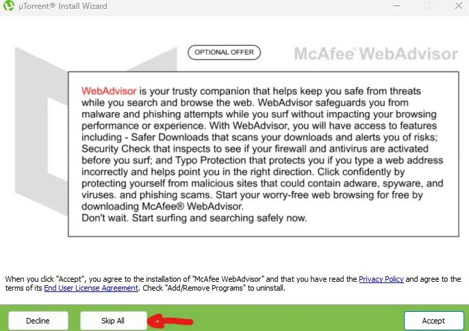 5. النقر على Skip All او Accept | #هذي الخطوه تعني عدم او قبول تحميل البرامج المعلن لها#